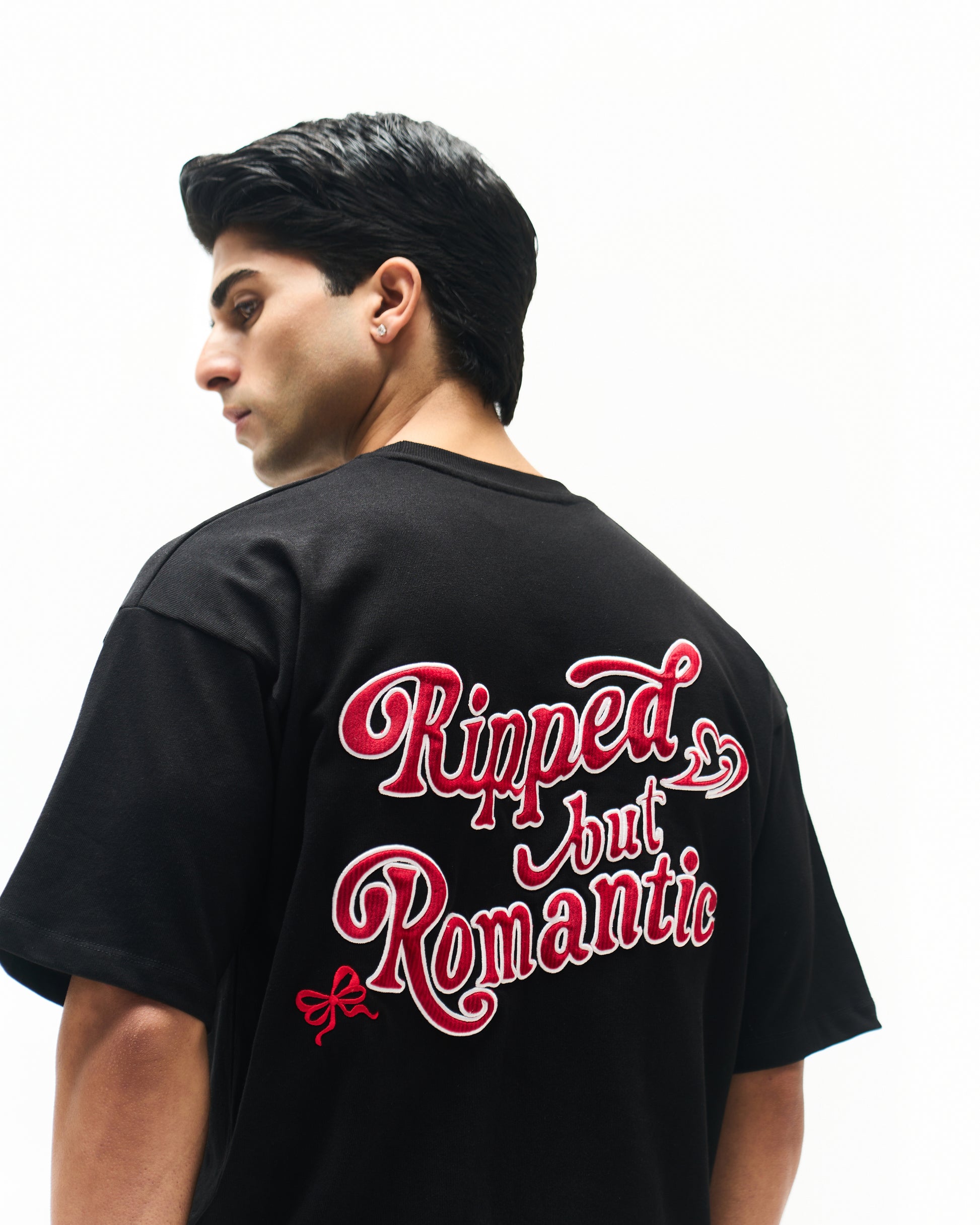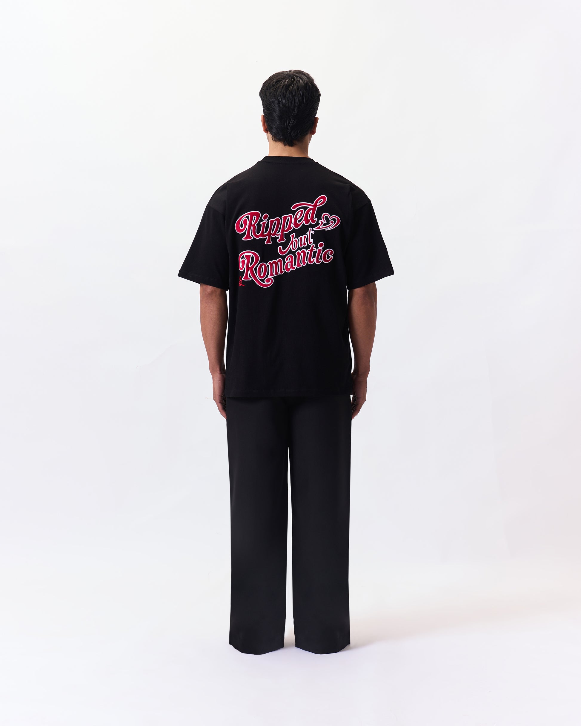 Ripped and Romantic applique embroidery bold stitched lettering with a soft , romantic edge, blending strength and sentiment in a striking back statement.
